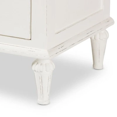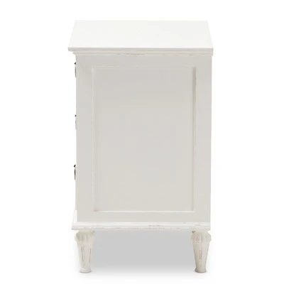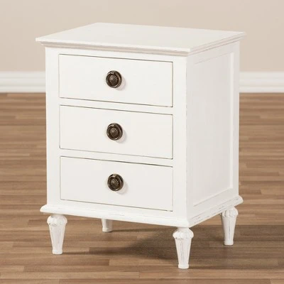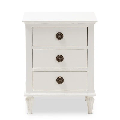 The Venezia 3-drawer nightstand is a functional and classic style piece that will instantly cozy up a bedroom space with its rustic charm. Inspired by French furniture, the Venezia is crafted from Mindi wood. Featuring whitewashed finishing and tapered legs that are fluted, bronze-plated hardware completes the look of a rustic design. Three of the drawers provide plenty of room for you to stowaway items and keep them close by. the Venezia has been built to last and is made to the highest quality design standards. Made in Indonesia, the Venezia requires legs assembly.