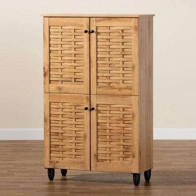 Keep your shoes organized and out of sight with the Winda shoe cabinet. Made in Malaysia, this cabinet is crafted from sturdy wood featuring a natural oak brown finish that easily coordinates with a wide range of interior designs. Four doors conceal six shelves with storage space for up to 18 pairs of shoes, depending on size. Requiring assembly, the Winda feature slits on the doors to enable air circulation and reduce odor buildup. A modern solution to entryway storage, the Winda shoe cabinet allows busy homes to feel more open and organized. Dimensions: 48.2″ High x 30″ Wide x 13.10″ Deep; Storage (Shelves) Dimensions: 6.8″ High x 28.03″ Wide x 11.50″ Deep; Legs: 3.74″ High;