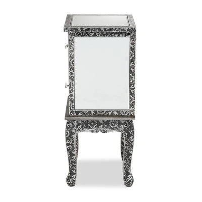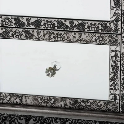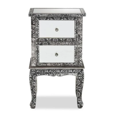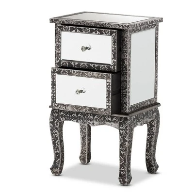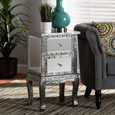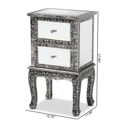 Introduce a bold statement of modern glamour to your interior with the extraordinary Wycliff end table. Made in China, this stunning piece is comprised of a solid wood frame adorned with an embossed metal trim featuring a floral pattern. Two drawers offer space to organize household essentials, while mirrored glass panels enrich the charisma of the piece. The Wycliff will arrive fully assembled and features cabriole legs for excellent stability and support in elegant style. Faux crystal drawer knobs lend a graceful touch, making the Wycliff end table a marvelous addition to any layout. Overall Dimensions: 27.80″ High x 15.70″ Wide x 11.80″ Deep; Drawer(Each): 11.00″ Wide x 9.40″ Deep x 6.70″ High; Legs: 11.80″ High;